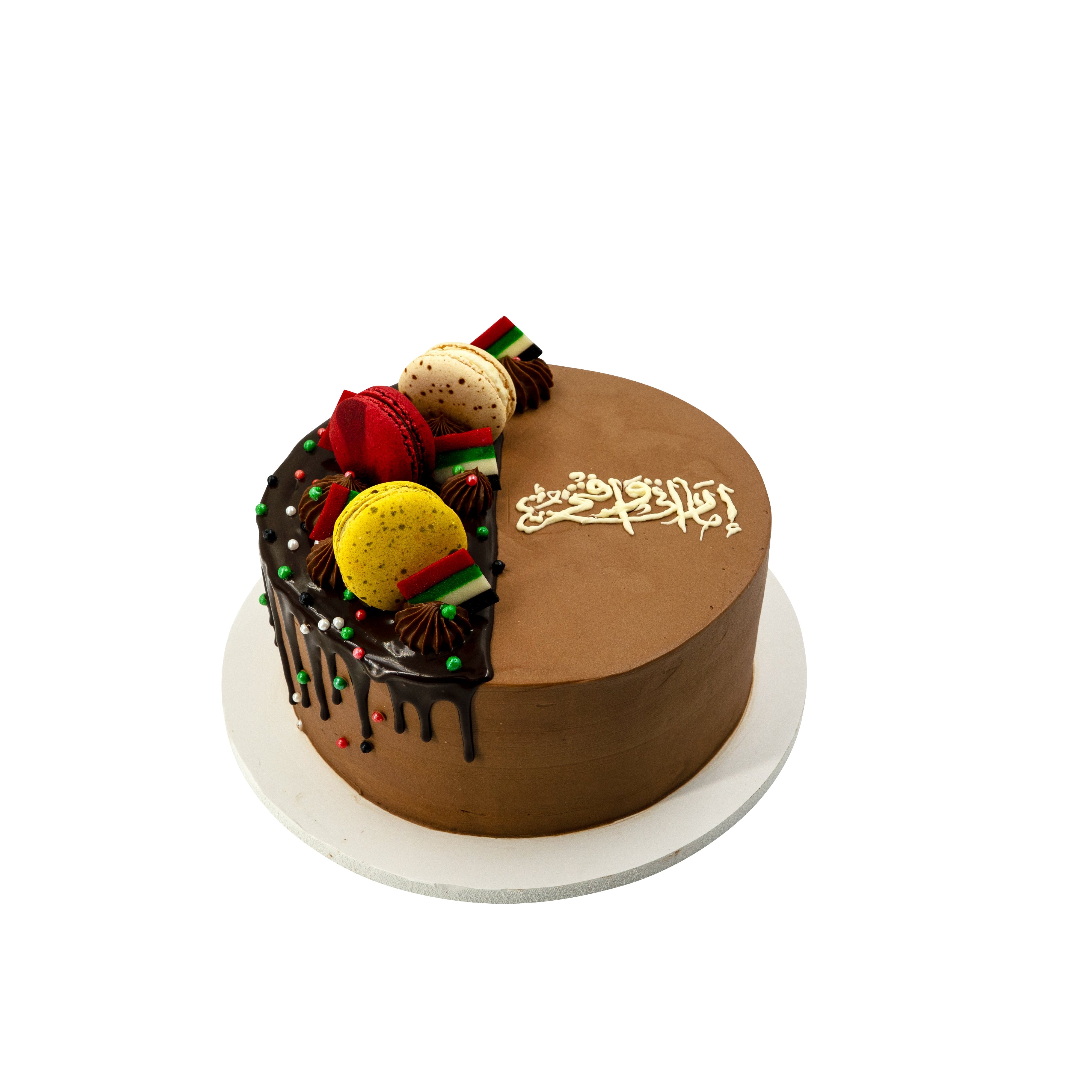 Rich chocolate cake topped with macarons and the UAE flag—celebrate in delicious style!