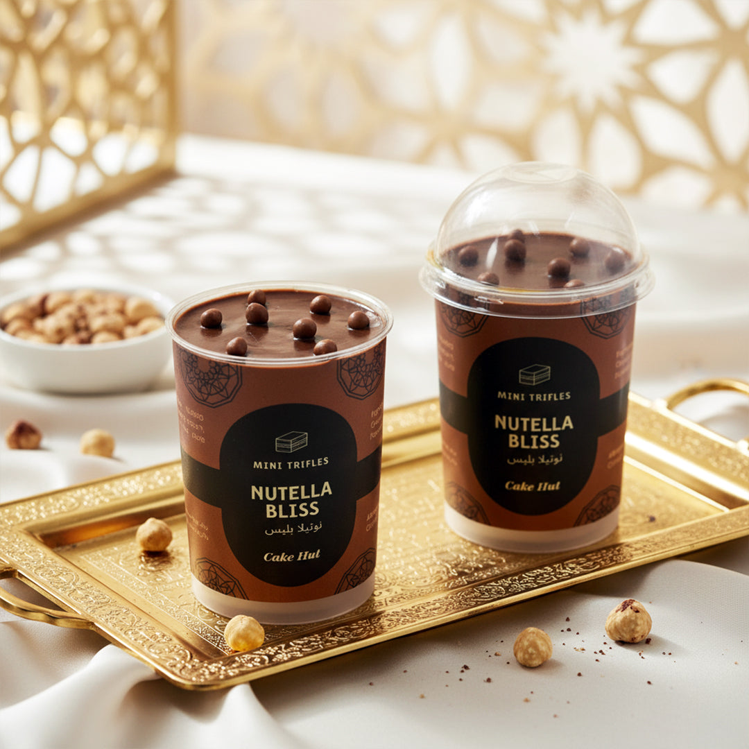 Nutella Bliss Trifle: Layers of rich Nutella mousse, chocolate cake, and whipped cream, finished with a hazelnut crunch for pure indulgence. Price per single pc.