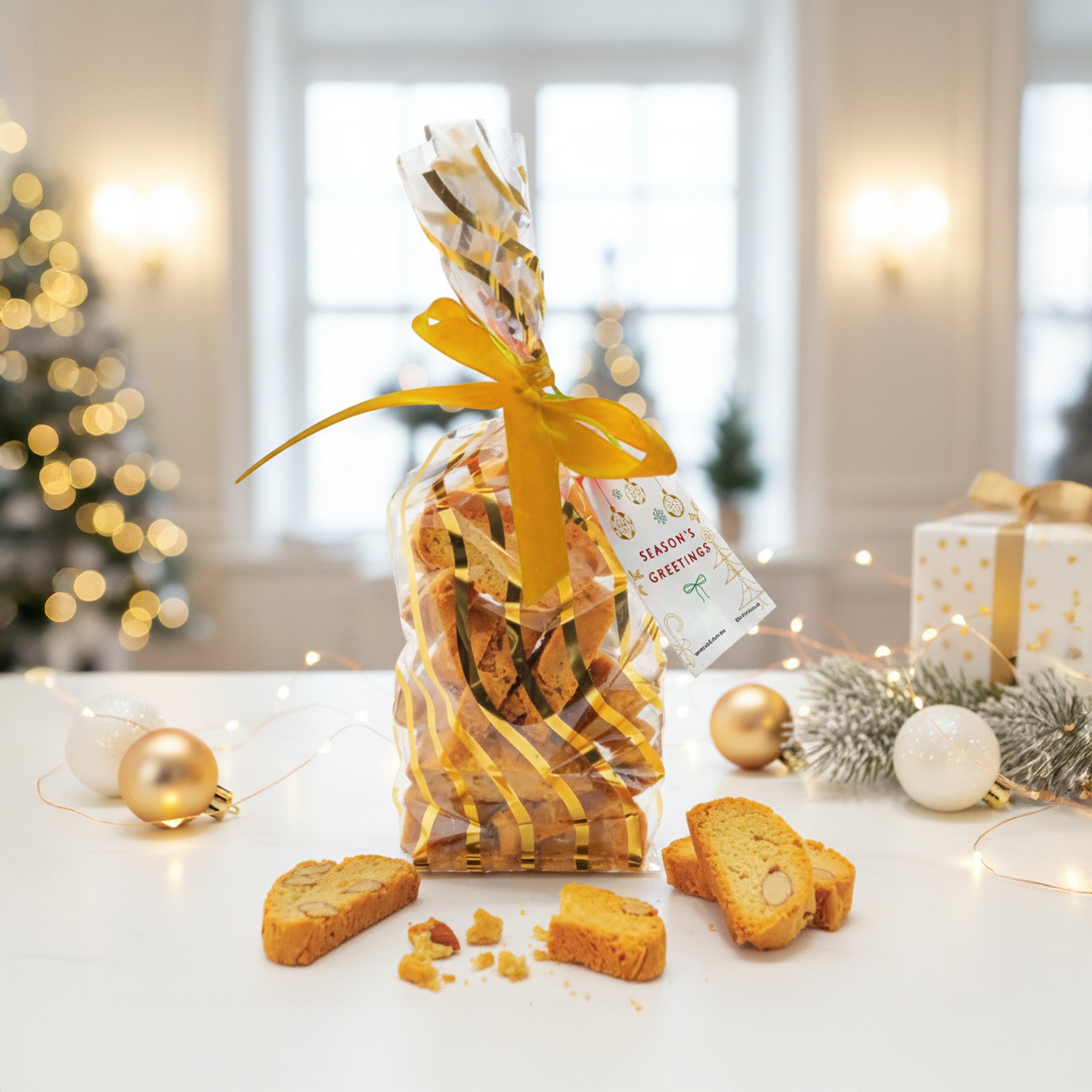 Crispy, nutty, and festive—our Almond Biscotti Cookies make the perfect holiday treat to enjoy with your favorite Christmas beverage!مقرمشة، جوزية، واحتفالية - بسكويت اللوز لدينا هي وجبة خفيفة مثالية للعطلة للاستمتاع بها مع مشروبك المفضل في عيد الميلاد!
