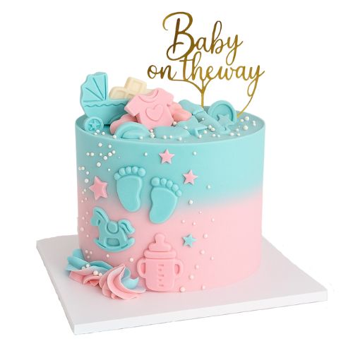 A pastel-perfect creation decorated with baby-themed fondant toppers, tiny footprints, and playful details—made to celebrate the sweetest journey ahead!